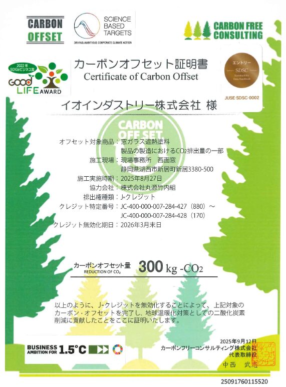本施策により、空調効率の改善を図ると同時に、J-クレジット制度を活用して300kg分のCO2カーボン・オフセットを完了いたしました。
