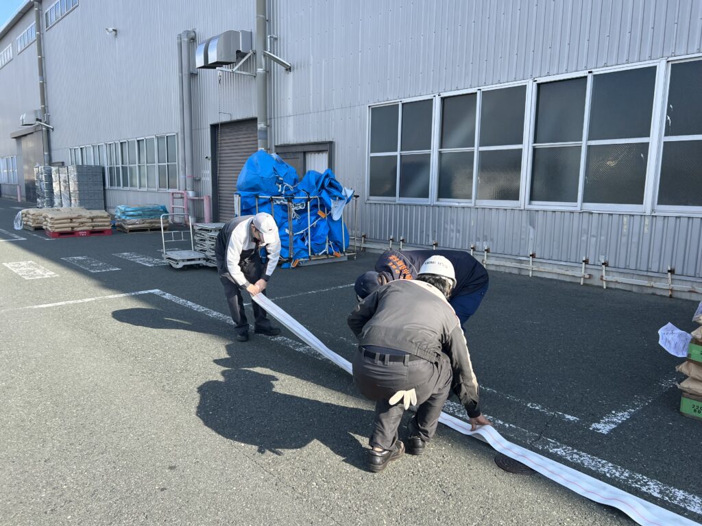 当日は、消火班25名に加えて希望者10名の合計35名が参加し、消火器の使い方や実際の消火訓練、さらに消火栓の取り扱い(ホースを伸ばす・つなぐ・放水姿勢の確認)など、実践的な内容を体験しました。